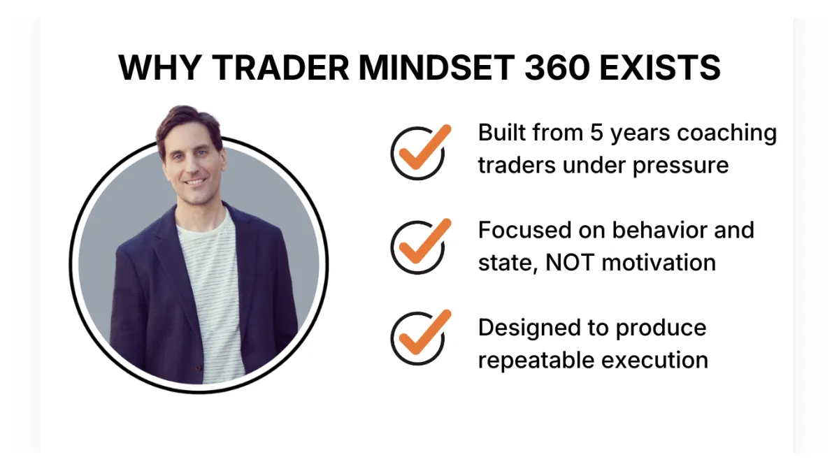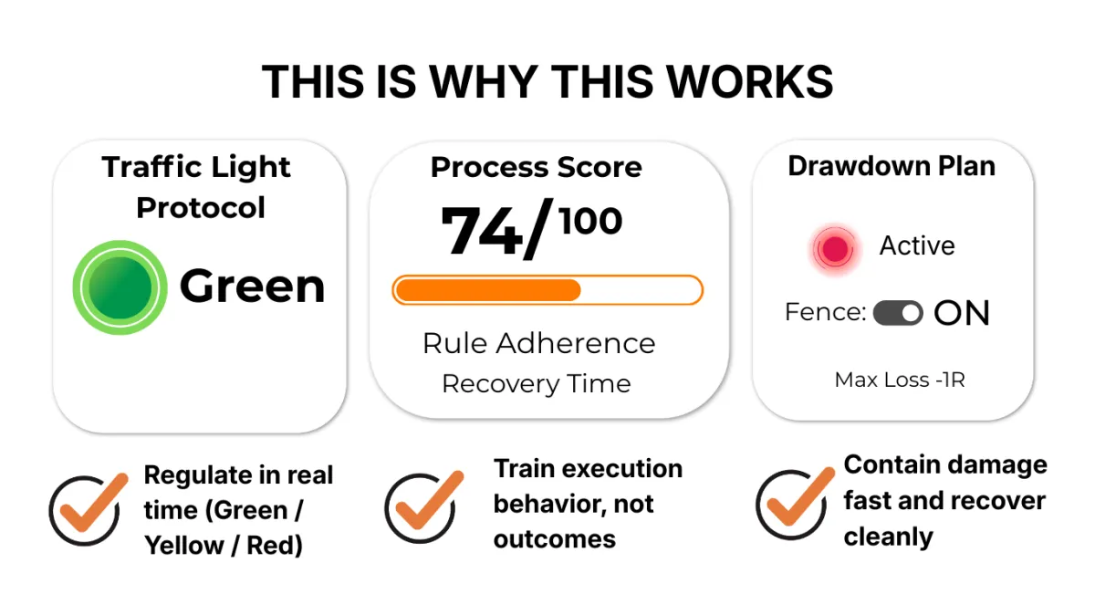 We don’t teach entries, indicators, or setups. We train the part that determines whether you follow your strategy under pressure: state control, self-talk, and execution behavior.